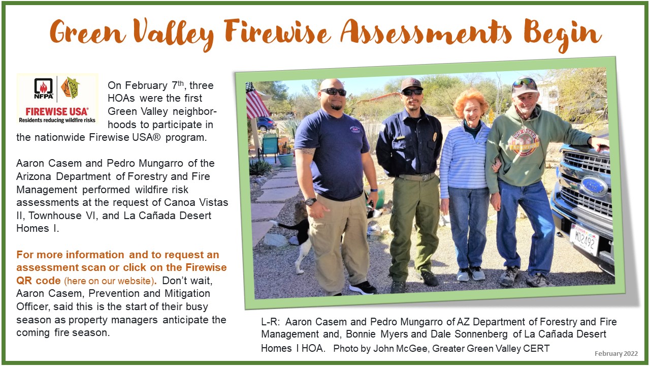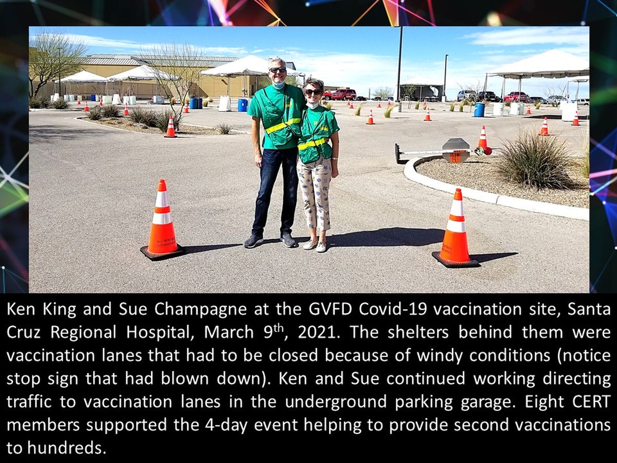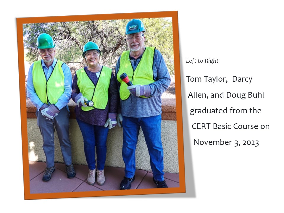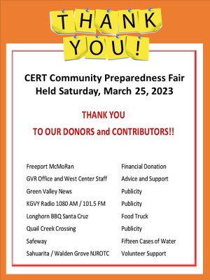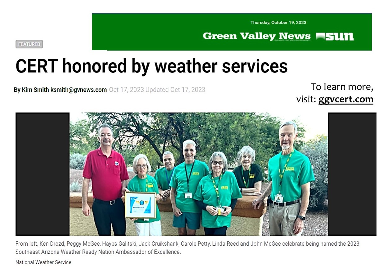 The Greater Green Valley Community Emergency Response Team (GGV CERT) is part of FEMA’s Citizens Corps. GGV CERT was formed in 2003 as a volunteer organization sponsored by the Green Valley Fire District. We currently have about 50 members, all of whom have completed 20-hours of training on how to organize for and respond to a disaster. We meet once a month at the GVFD Training Center for follow-up training.